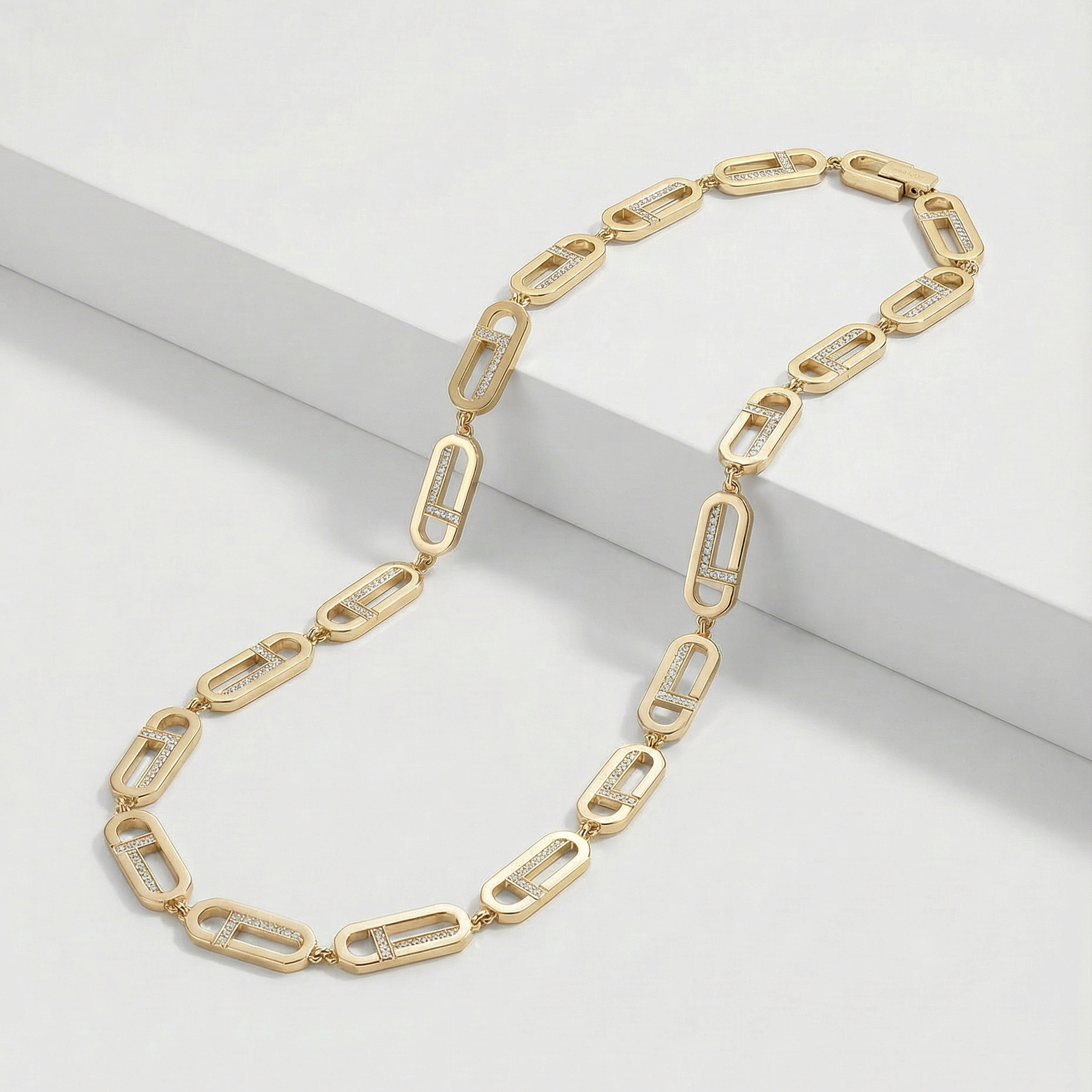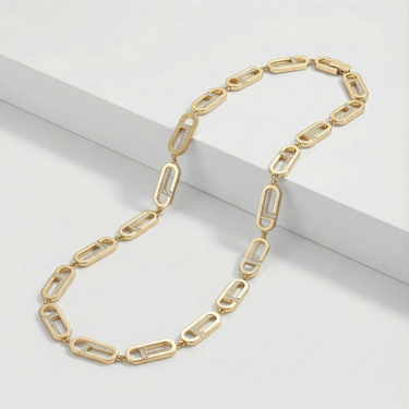 Crafted in solid 18K yellow gold and set with natural diamonds, the necklace balances weight, precision, and restraint. The continuous construction gives it presence without excess, making it suitable for everyday wear or elevated occasions.